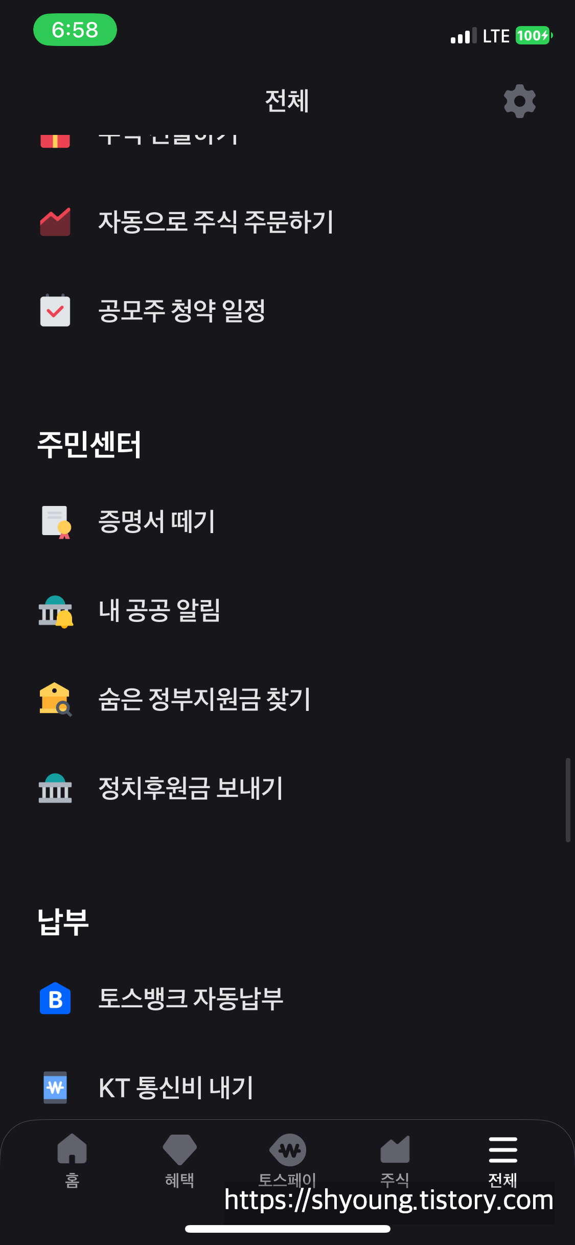 토스 앱에서 오른쪽 하단 전체를 선택해서